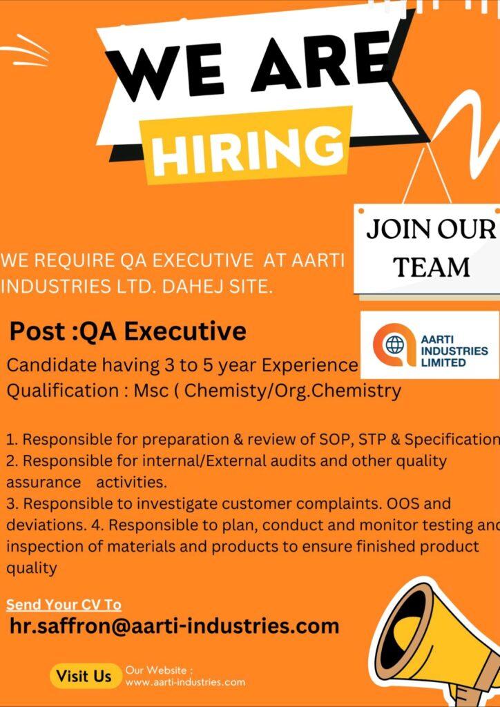WE REQUIRE QA EXECUTIVE AT AARTI INDUSTRIES LTD. DAHEJ SITE.