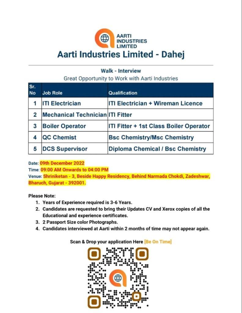 Aarti Industries Limited – Dahej Walk Interview for ITI Electrician, Mechanical Technician, Boiler Operator, QC Chemist, DCS Supervisor on 09th December 2022