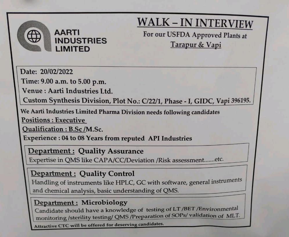 Aarti Industries Limited, Walk-In Interviews for Quality Assurance / Quality Control & Microbiology on 20th Feb’ 2022