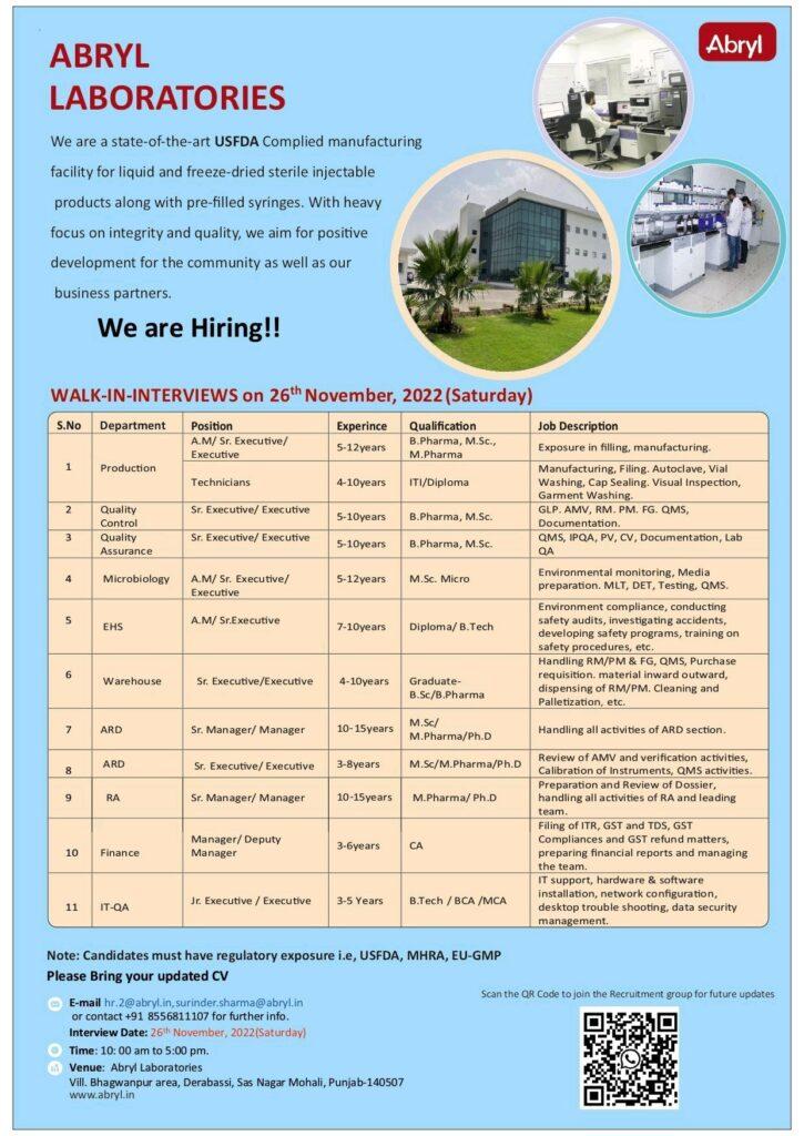 Abryl Laboratories Walk In Interview for Technicians, Jr. Executive / Executive/Sr. Manager/ Manager / AM /Deputy Manager- Production, Quality Control, Quality Assurance, Microbiology, EHS, Warehouse, ARD, RA, Finance & IT QA on 26 November 2022