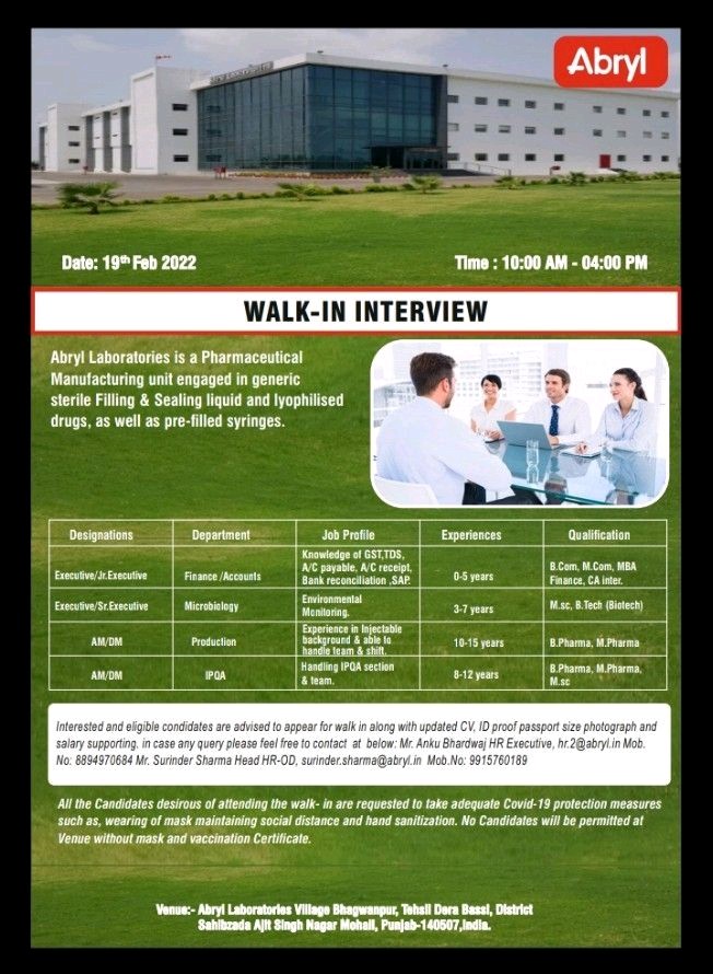 Abryl Laboratories, Walk-In Interviews for Production / Microbiology / IPQA / Finance & Accounts on 19th Feb’ 2022