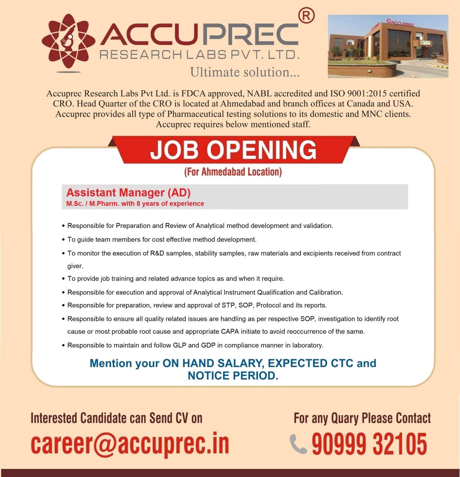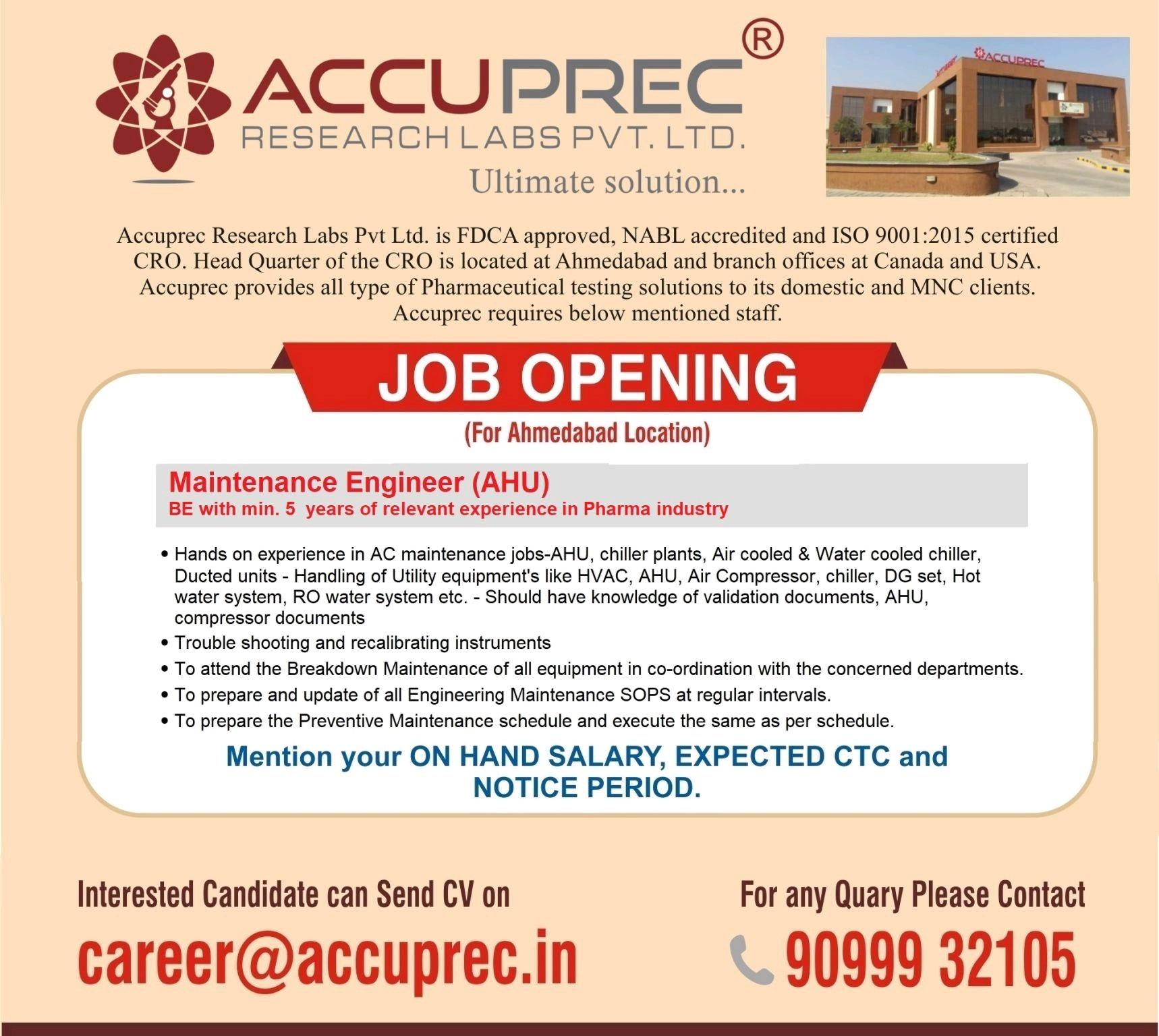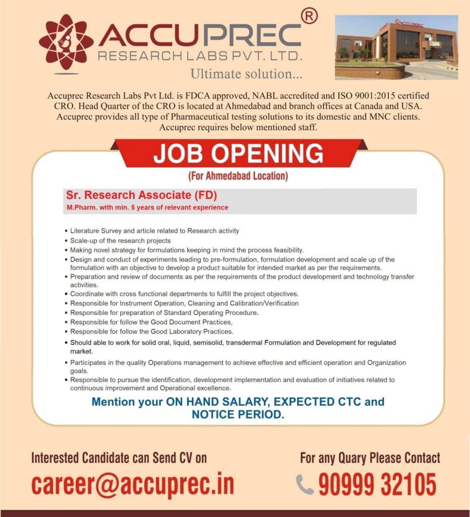 Accuprec Research, Job Openings for Sr. Research Associate(FD)/ Asst. Manager (AD) & Engineering (AHU) department