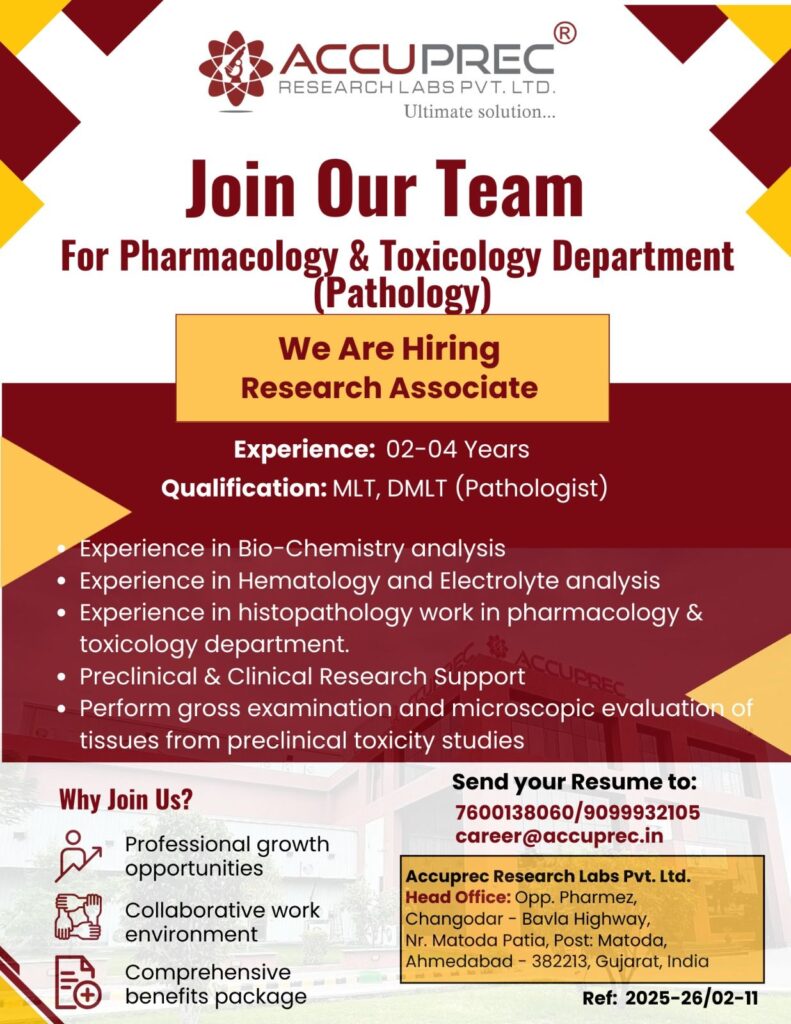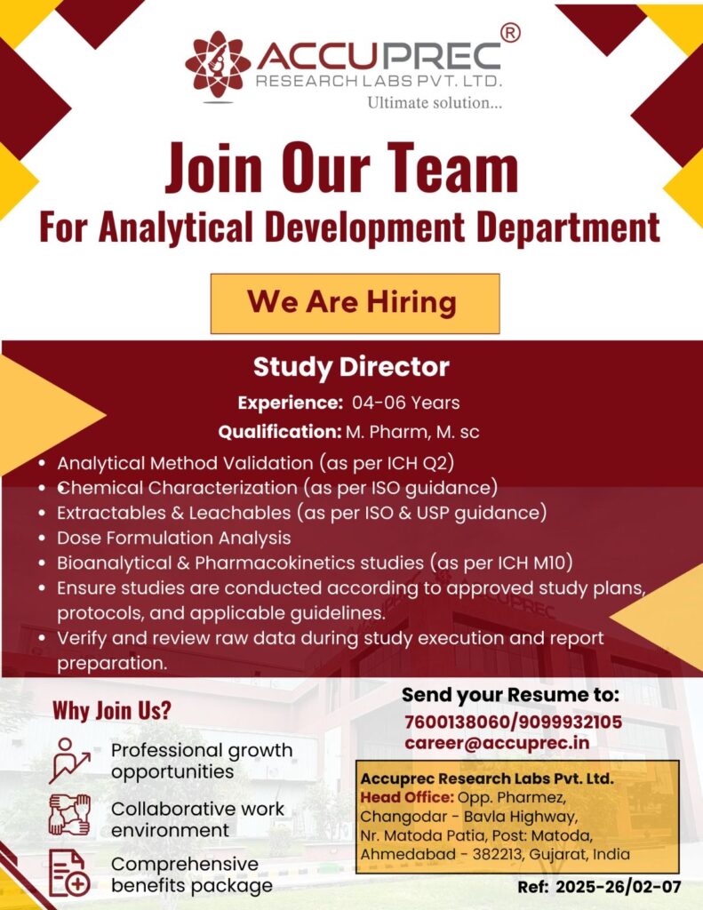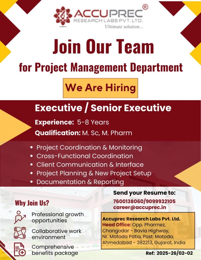 Accuprec Research Labs is inviting applications for multiple departments including Analytical Development, Regulatory Affairs, Project Management, IT, Mechanical, AD&QC, and Pharmacology.