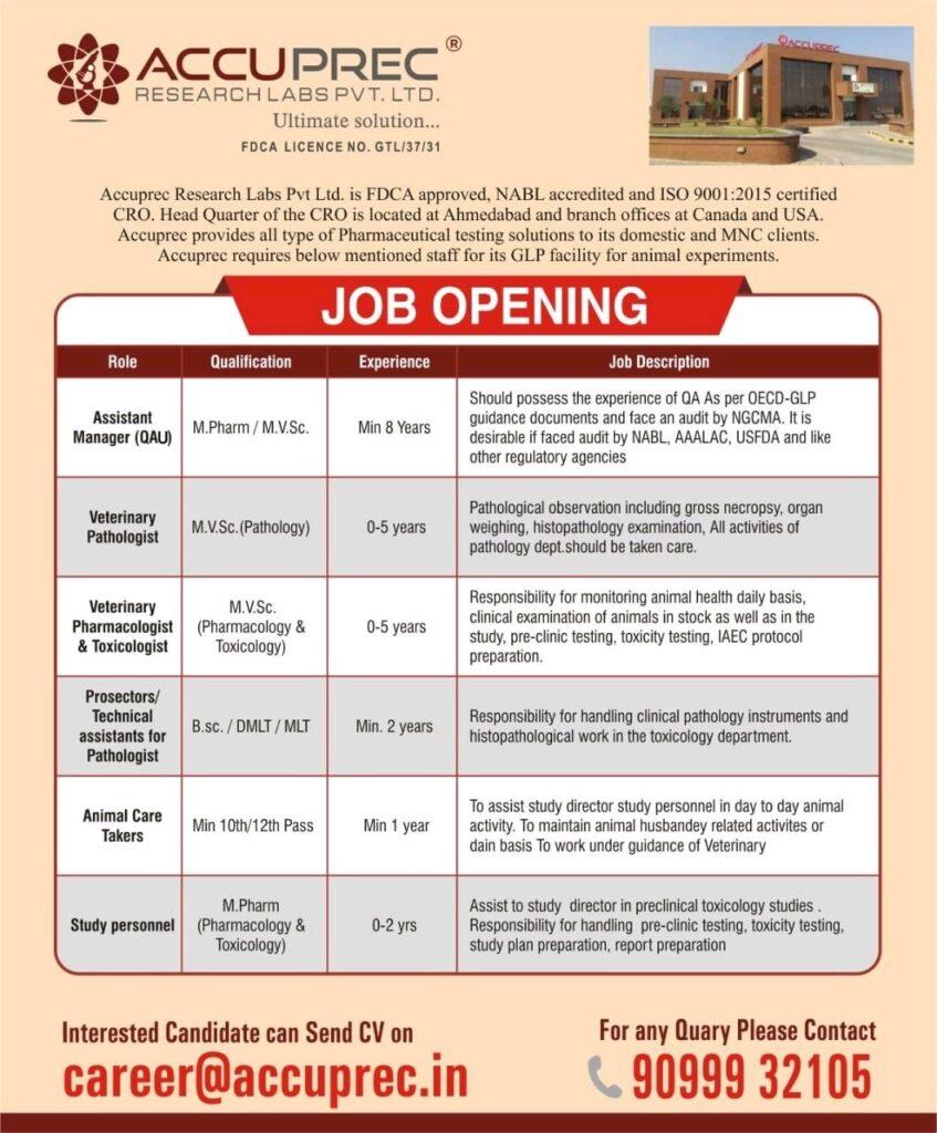 Accuprec Research Labs, Job Openings for freshers & experience- QAU/ Study Personnel/ Veterinary Pharmacologist & Toxicologist/ Prosectors/ Technical Assistant for Pathologist/ Animal Care Takers – Apply Now