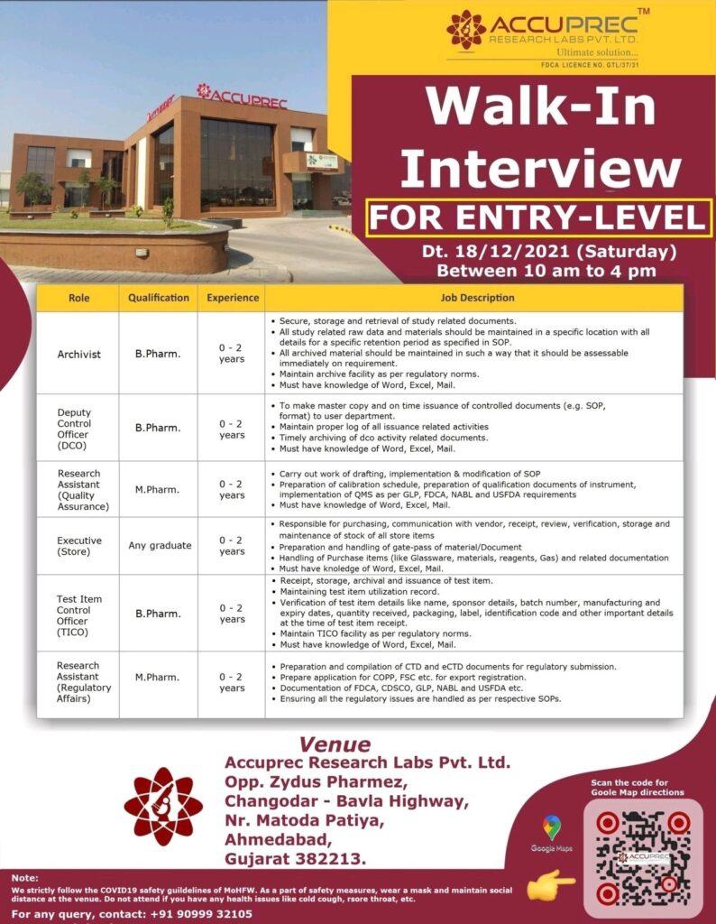 Accuprec Research Labs, Walk In Interview for Freshers & Experience B.Pharm / M.Pharm / Any Graduate in QA / Regulatory Affairs / DCO / Store / Archivist on 18th Decโ21