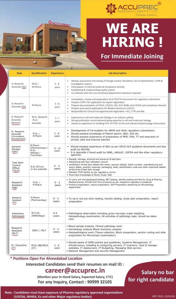 ACCUPREC RESEARCH LABSPVT.LTD hiring FRESHERS & experience for multiple openings in QA, RA, R&D, PT, Pathologist, MLT & IT department