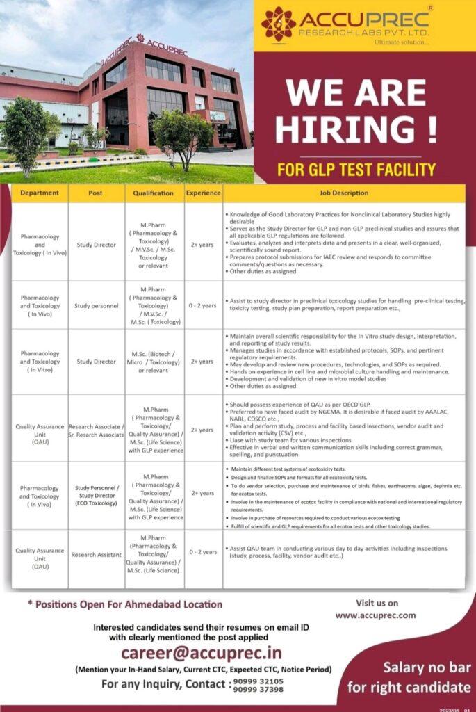 ACCUPREC RESEARCH – Multiple Job Opening – For GLP Test Facility (Pharmacology and Toxicology, QAU