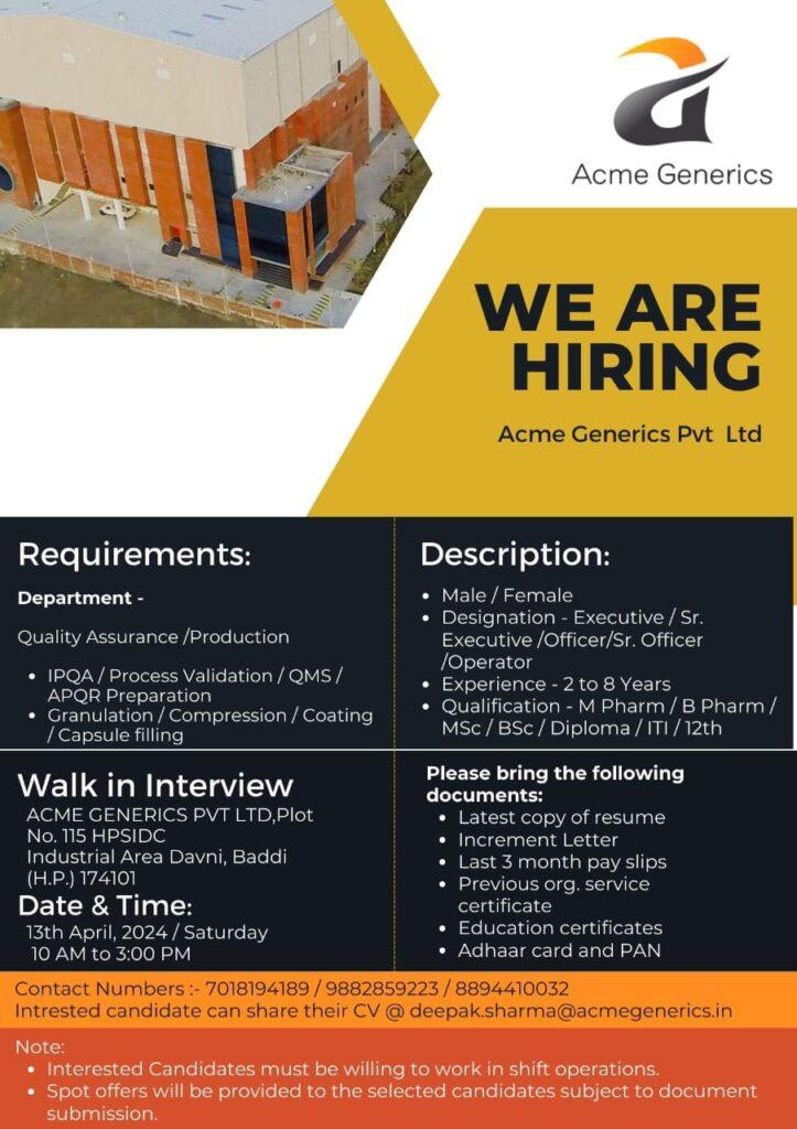 Acme Generics Walk in alert | QA, Production | on 13th April, 2024 (Saturday)