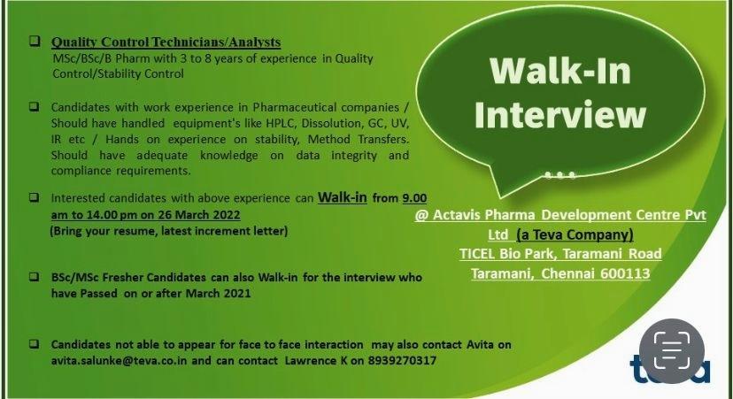 Actavis Pharma Development Center Pvt Ltd (a Teva Company) Walk-in Interview for Quality Control Technicians/ Analysts on 26th March 2022