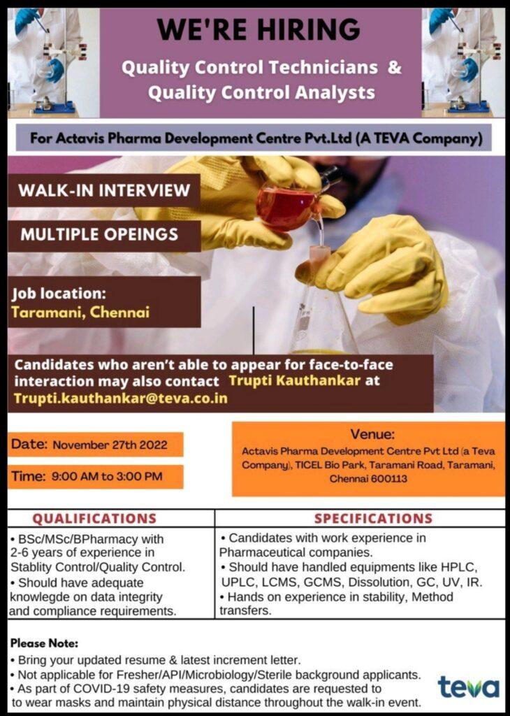 Actavis Pharma Development Centre (A TEVA Company) Walk In Interview for QC Technicians & QC Analysts on November, 27th 2022