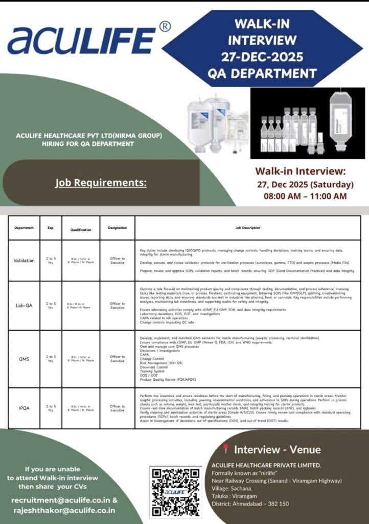 Aculife Healthcare Private Limited, a prominent member of the Nirma Group, has announced an upcoming walk-in interview drive for its Quality Assurance (QA) department. This is a significant opportunity for pharmaceutical professionals looking to advance their careers in a sterile manufacturing environment.