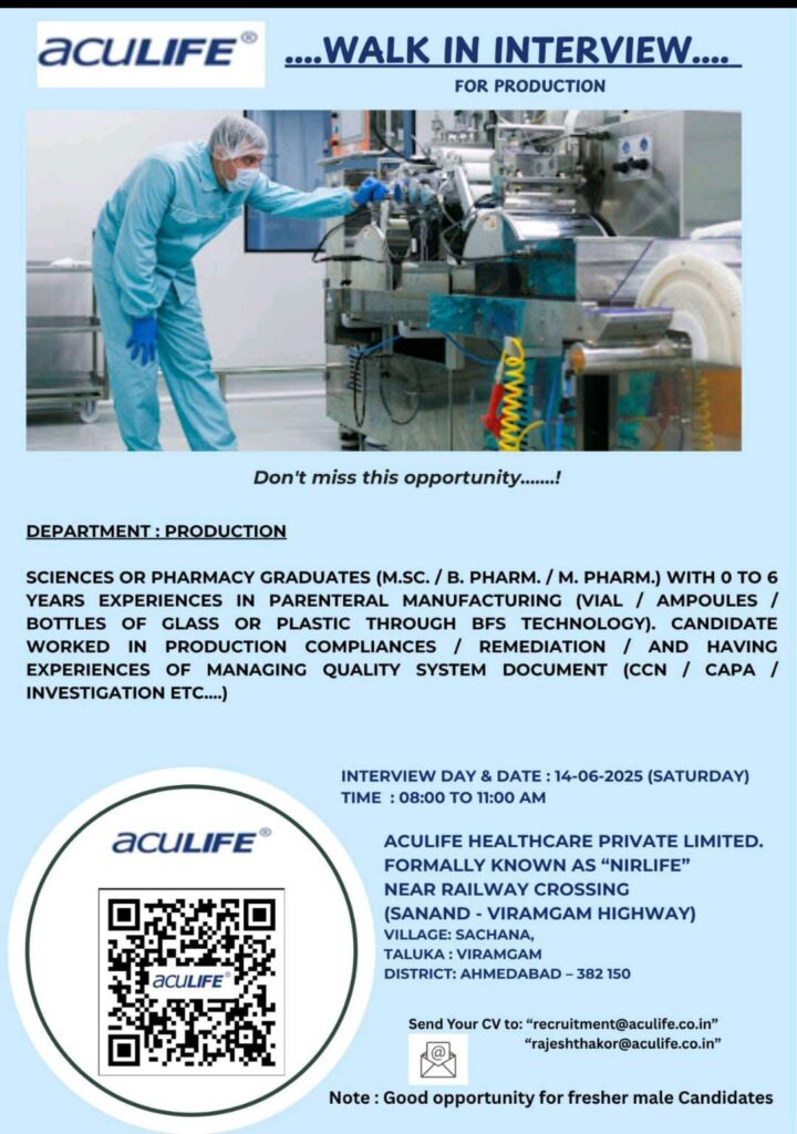 SCIENCES OR PHARMACY GRADUATES (M.SC. / B. PHARM. / M. PHARM.) WITH O TO 6 YEARS EXPERIENCES IN PARENTERAL MANUFACTURING (VIAL / AMPOULES / BOTTLES OF GLASS OR PLASTIC THROUGH BFS TECHNOLOGY). CANDIDATE WORKED IN PRODUCTION COMPLIANCES / REMEDIATION / AND HAVING EXPERIENCES OF MANAGING QUALITY SYSTEM DOCUMENT (CCN / CAPA /