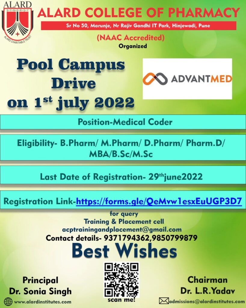 We are glad to inform you that Training & Placement Cell of Alard College of Pharmacy, Pune organizing Advantmed India LLP. Offline Pool Campus Recruitment Drive for the experienced and fresher students.
