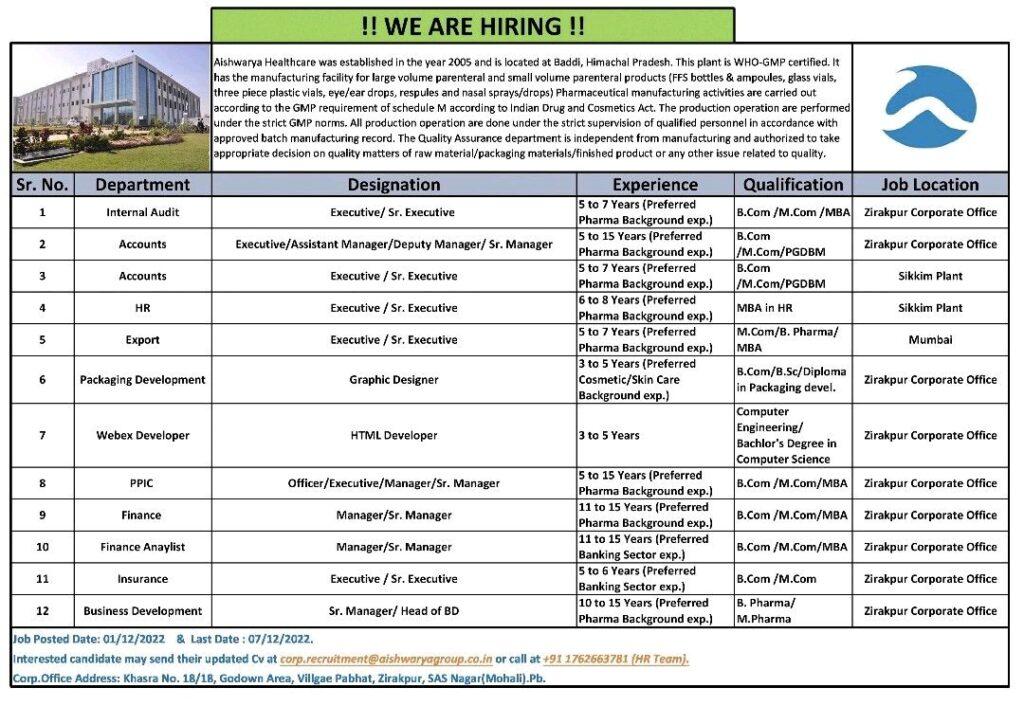 Aishwarya Healthcare hiring for Business Development, Internal Audit, Accounts, HR, Export, Packaging Development, PPIC, Finance, Finance Anaylist, Insurance, Business Development department