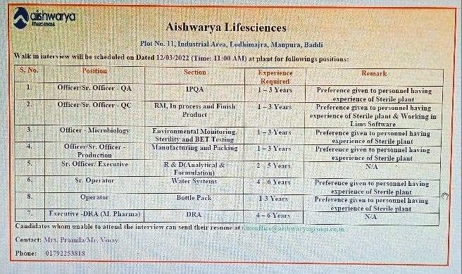 Aishwarya Lifescience : Walk-In Interviews for QA / QC / Microbiology & Production on 12th Mar’ 2022