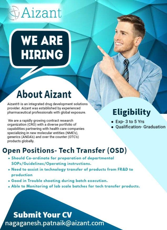 Interested candidates can send their resumes to nagaganesh.patnaik@aizant.com & should mention subject as “Tech Transfer”.