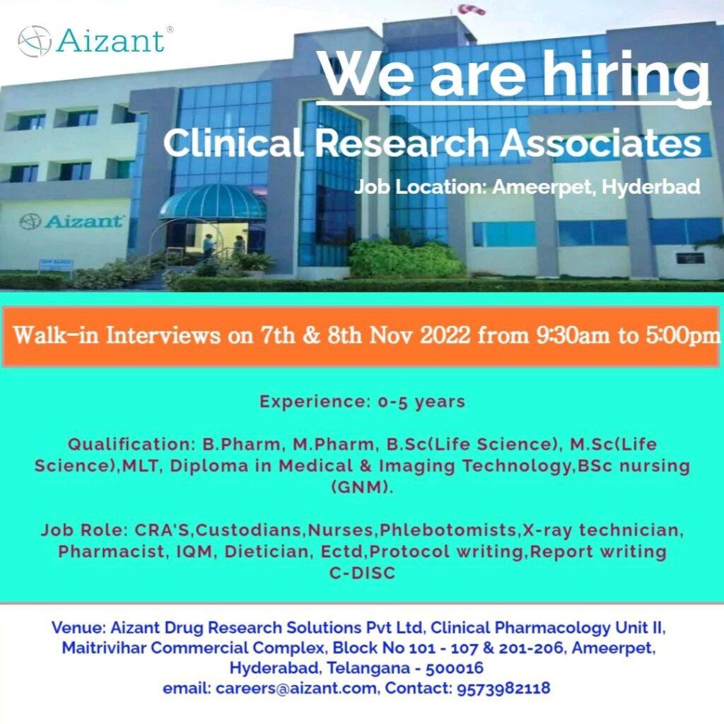 Aizant Drug Research Solutions hiring FRESHERS B.Pharm, M.Pharm, B.Sc, M.Sc, MLT, Diploma in Medical & Imaging Technology, BSc nursing for Clinical Research Associates – Walk-in Interviews on 7th & 8th Nov 2022