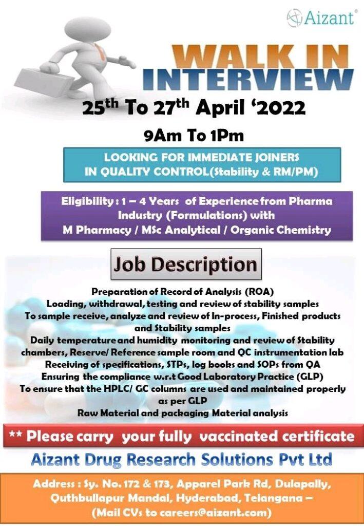 Aizant Drug Research Solutions Pvt Ltd WALK IN INTERVIEW for QUALITY CONTROL department on 25th To 27th April ‘2022