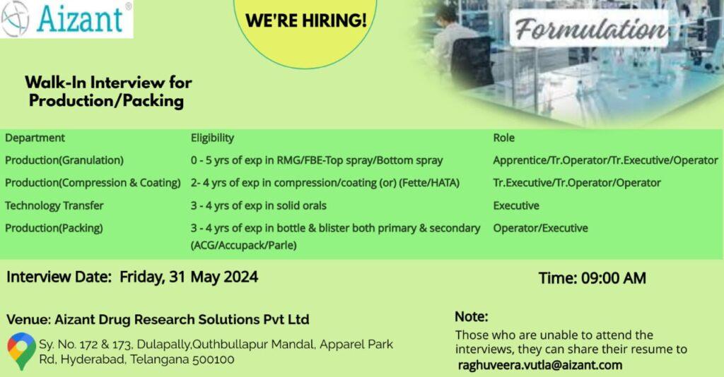 Aizant Drug Research Solutions Walk-In Interview for Production (Granulation/ Compression & Coating/ Packing/ Technology Transfer) on Friday, 31 May 2024