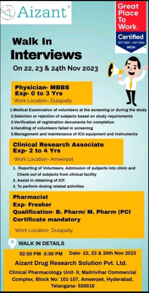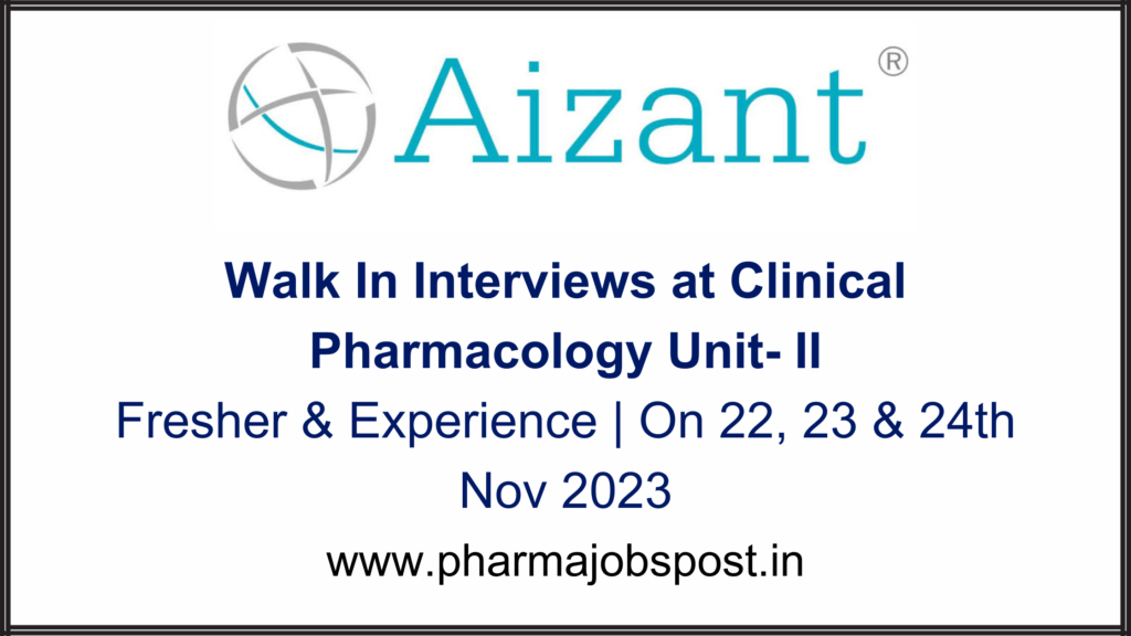 Aizant Drug Research Walk In Interviews at Clinical Pharmacology Unit- II for multiple vacancy | Fresher & Experience | On 22, 23 & 24th Nov 2023