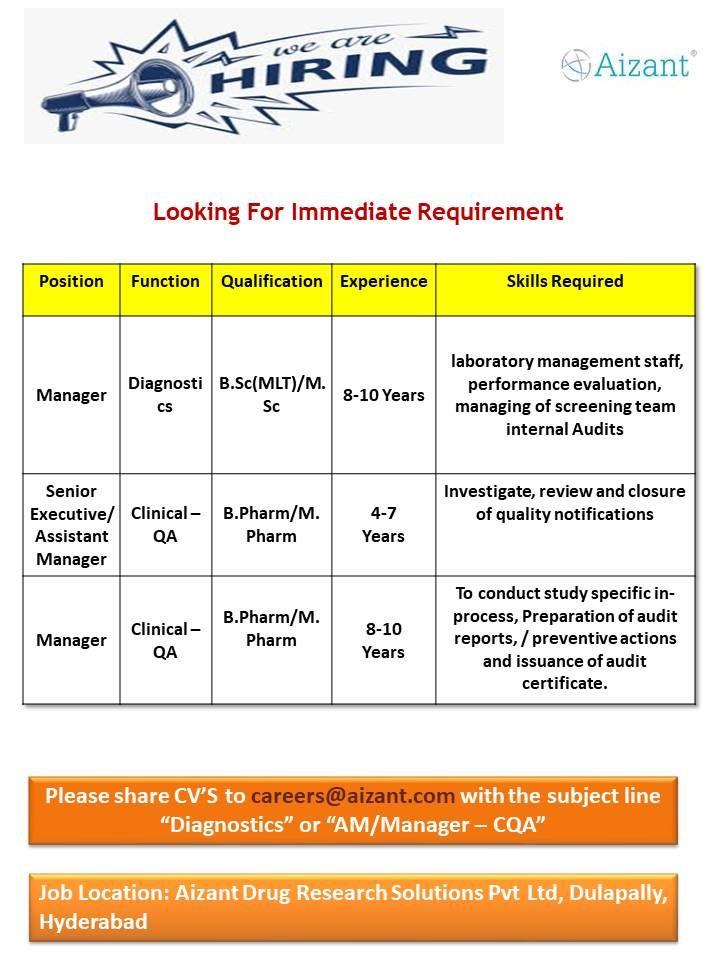 Please share CV’S to careers@aizant.com with the subject line “Diagnostics” or “AM/Manager – CQA”