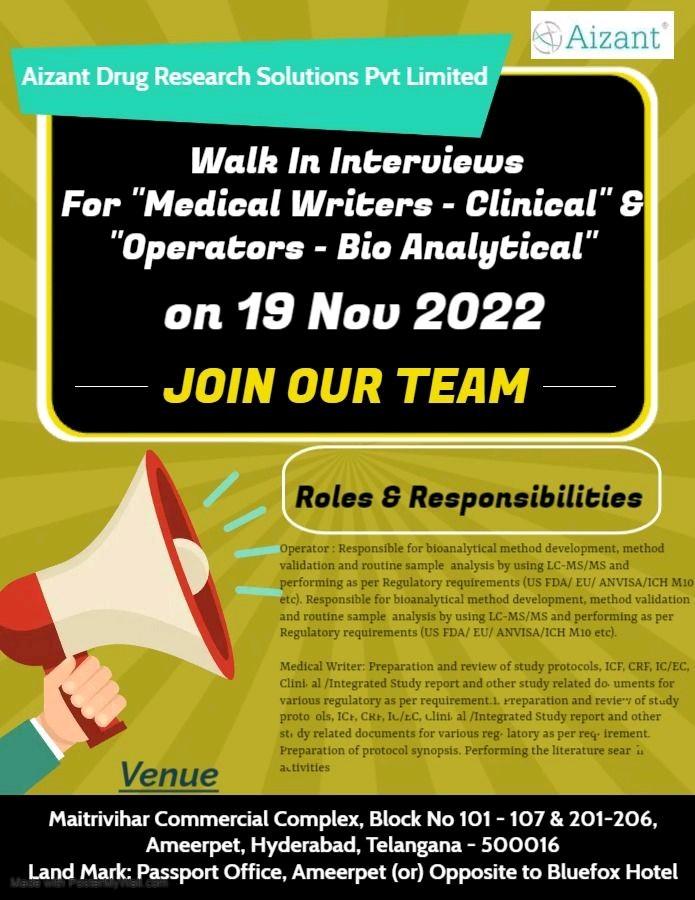 Aizant Walk In Interviews for Medical Writers – Clinical” & “Operators – Bio Analytical” on 19th Nov 2022