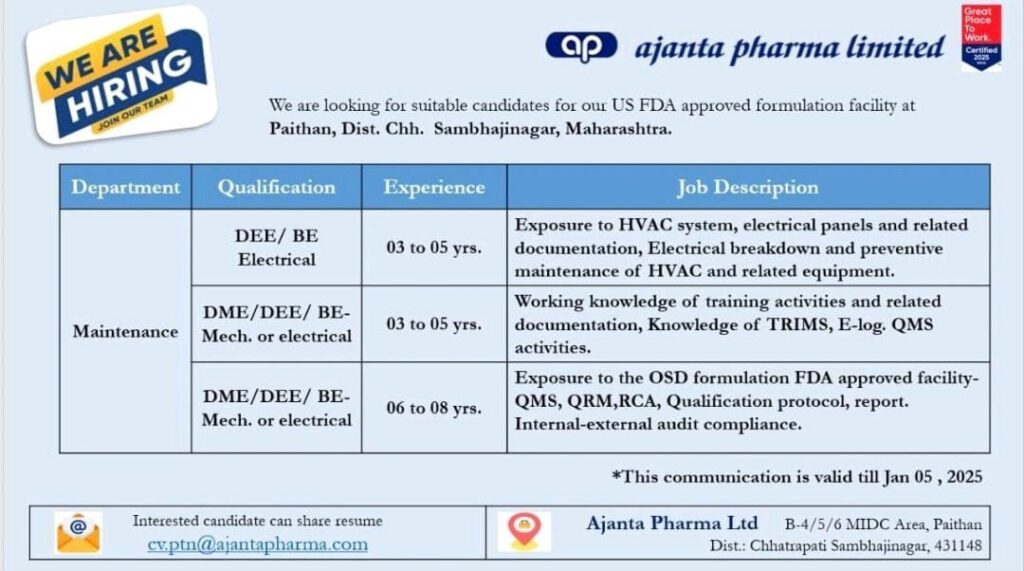 Ajanta Pharma Limited, a leading name in the pharmaceutical industry, is currently seeking skilled professionals for its US FDA approved formulation facility. This recruitment drive is specifically for the Maintenance Department at their site in Paithan, Chhatrapati Sambhajinagar, Maharashtra.
