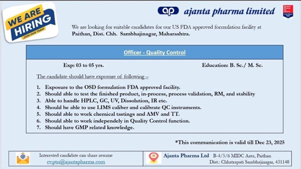 Ajanta Pharma Limited is seeking suitable candidates for the position of Officer – Quality Control at their US FDA approved formulation facility located in Paithan, Dist. Chh. Sambhajinagar, Maharashtra.
