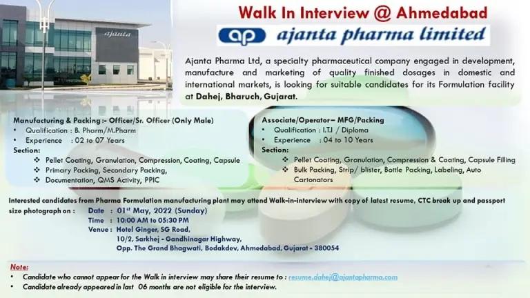 Candidates cannot appear the walk in interview may share their resume to: resume.dahej@ajantapharma.com