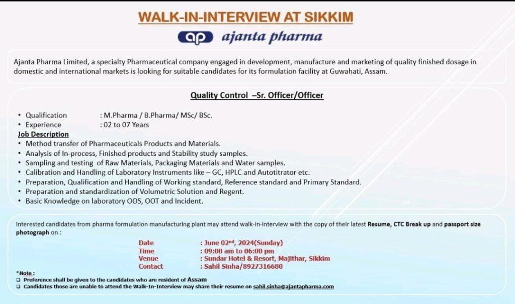 Ajanta Pharma Limited walk in interview for Sr. Officer/ Officer in Quality Control department on June 02nd, 2024 (Sunday)