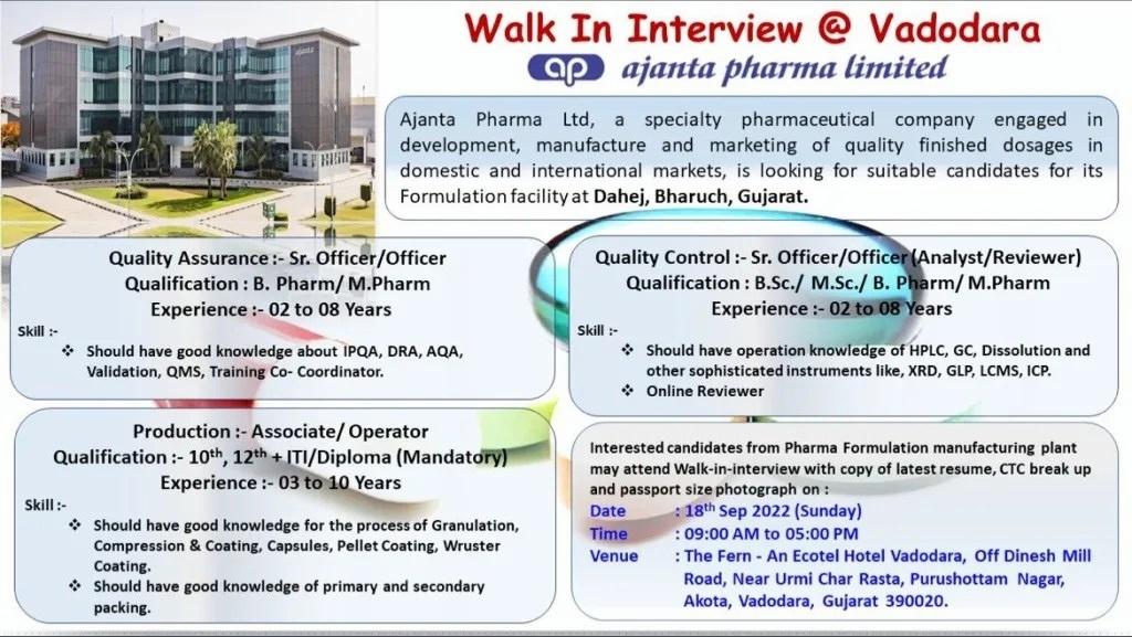 Ajanta pharma limited Walk In Interview @ Vadodara for QA, QC & Production on 18th Sep 2022 (Sunday)