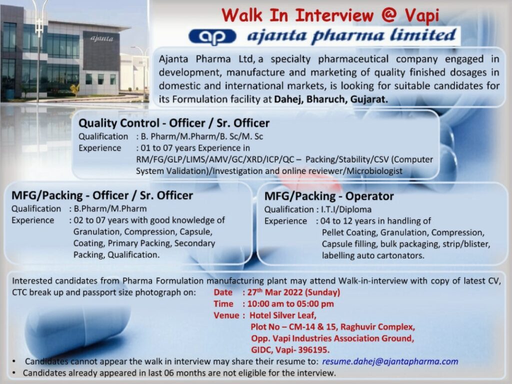 Ajanta Pharma Ltd. Walk In Interview for MFG/ Packing & Quality Control department on 27th March 2022 (Sunday) @Vapi