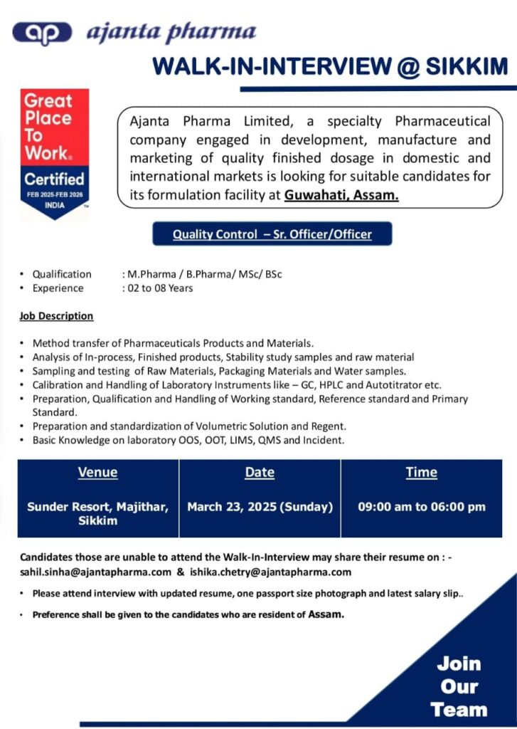 Candidates those are unable to attend the Walk-In-Interview may share their resume on : – sahil.sinha@ajantapharma.com & ishika.chetry@ajantapharma.com
