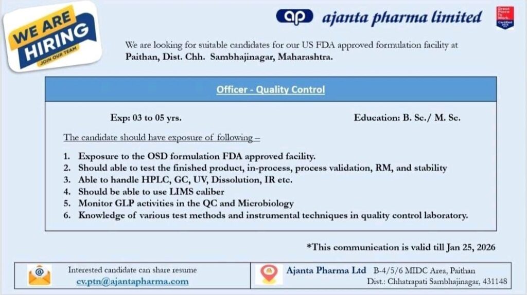 Ajanta Pharma Limited, a globally recognized pharmaceutical leader, has announced new job openings for its US FDA-approved formulation facility located in Paithan, Maharashtra. This recruitment drive targets experienced Quality Control professionals looking to advance their careers within a “Great Place to Work” certified organization.