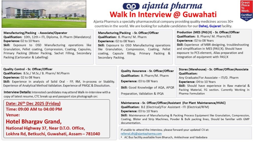 Ajanta Pharma, a leading specialty pharmaceutical company with a global presence in over 30 countries, has announced a massive walk-in interview drive in Guwahati. This recruitment drive is specifically for their state-of-the-art facility located in Dahej, Gujarat.