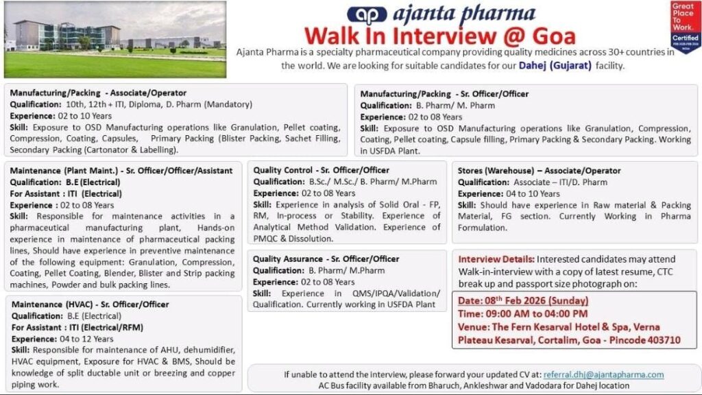 Ajanta Pharma, a leading specialty pharmaceutical company with a global footprint in over 30 countries, has announced a major recruitment drive. The company is hosting a Walk-In Interview in Goa on February 8, 2026, to find skilled professionals for its state-of-the-art facility located in Dahej, Gujarat.