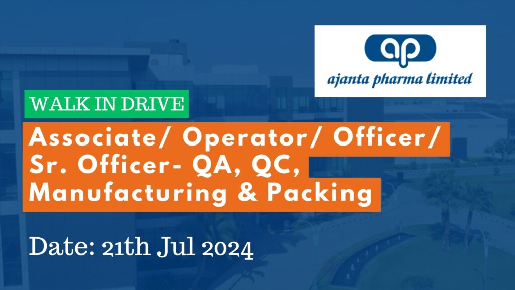 Ajanta Pharma Walk In Interview for Associate/ Operator/ Officer/ Sr. Officer- QA, QC, Manufacturing & Packing on 21th Jul 2024