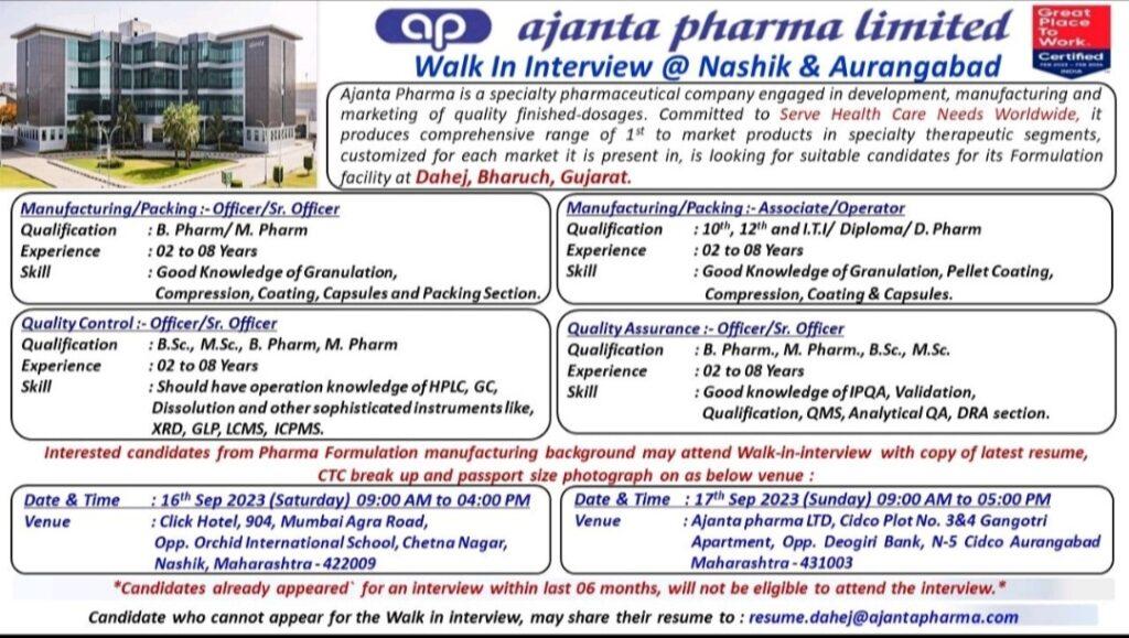 Candidate who cannot appear for the Walk in interview, may share their resume to: resume.dahej@ajantapharma.com