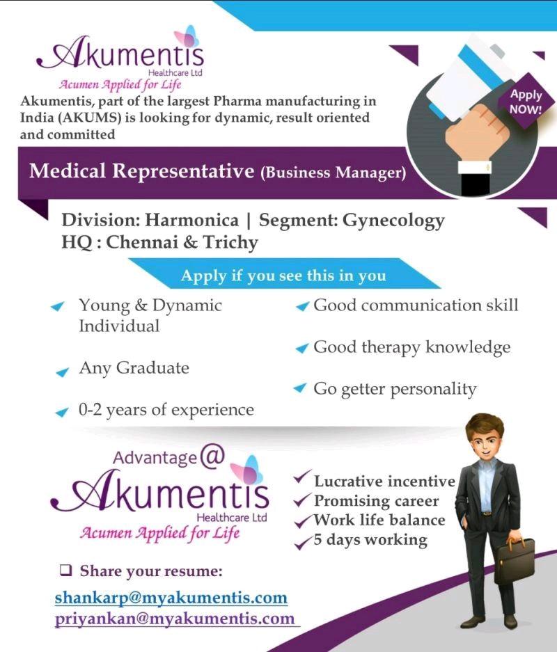 Akumentis Healthcare Ltd hiring Freshers & experience candidates for Medical Representative (Business Manager)