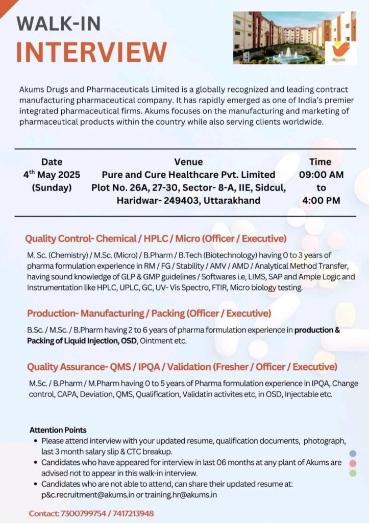 Akums Drugs and Pharmaceuticals Limited, a globally recognized leader in contract manufacturing, is hosting a walk-in interview. As one of India’s premier integrated pharmaceutical firms, Akums specializes in manufacturing and marketing high-quality pharmaceutical products for domestic and international clients.