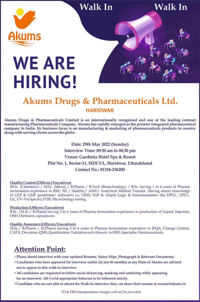 Akums Drugs & Pharmaceuticals Walk In Interview for QA, QC & Production on 29th May 2022 (Sunday)