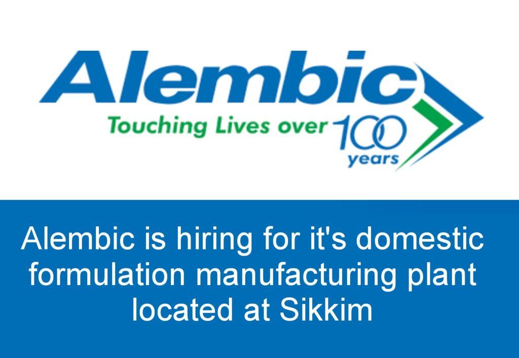 Alembic is hiring for it’s domestic formulation manufacturing plant located at Sikkim