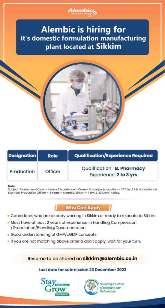Alembic is hiring for it’s domestic formulation manufacturing plant located at Sikkim