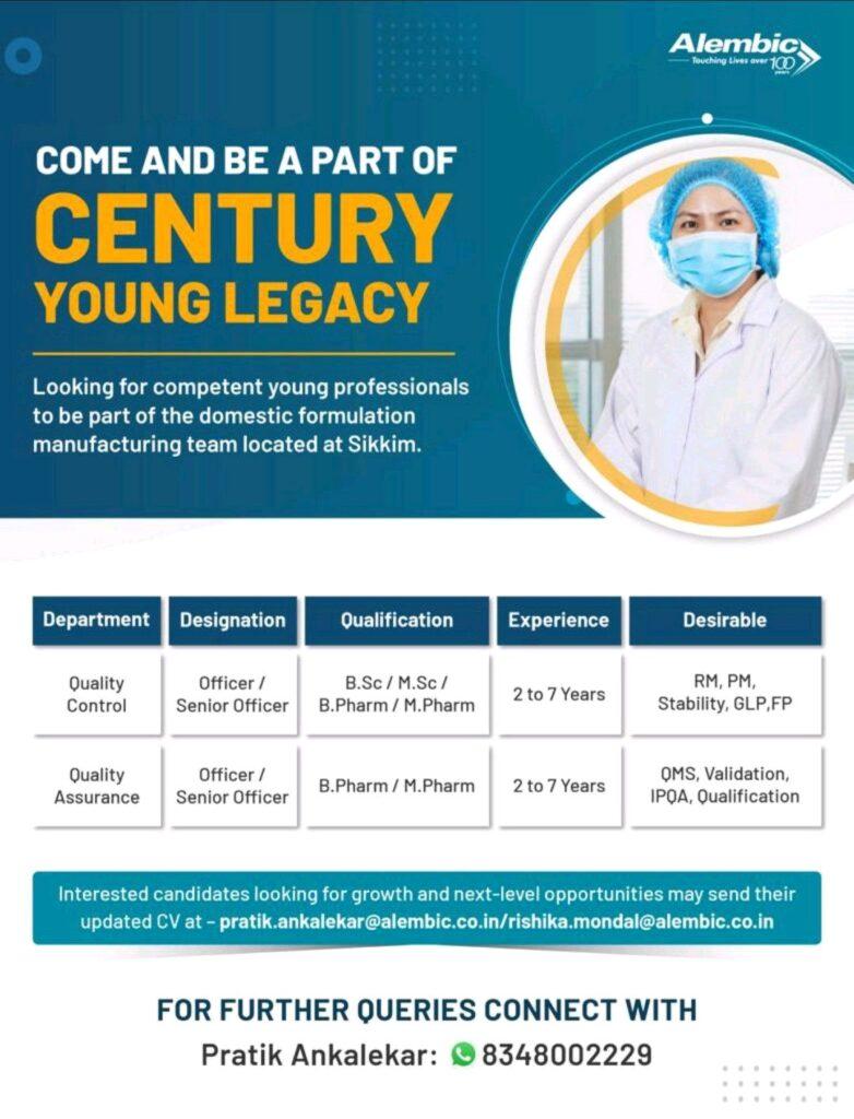 Interested candidates looking for growth and next-level opportunities may send their updated CV at – pratik.ankalekar@alembic.co.in/ rishika.mondal@alembic.co.in