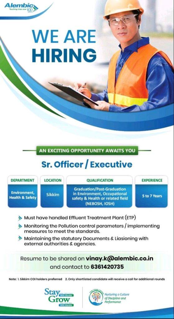 Alembic Pharma, hiring for Sr. Officer/ Executive in Environment Health & Safety Department at Sikkim location