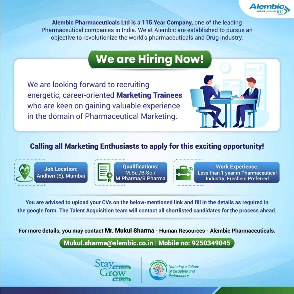 Alembic is looking forward to recruiting energetic, career oriented ‘Marketing Trainees’ who are keen on gaining valuable experiences in the domain of Pharmaceutical Marketing.