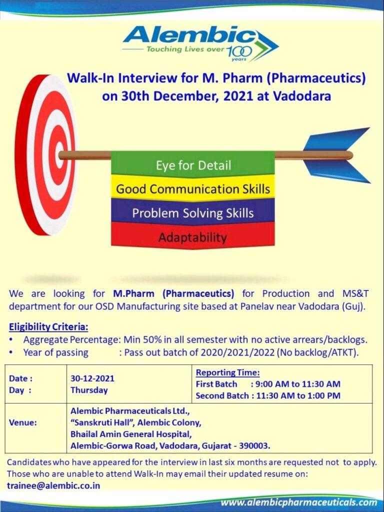 Alembic walk in for M.Pharm on 30th December, 2021