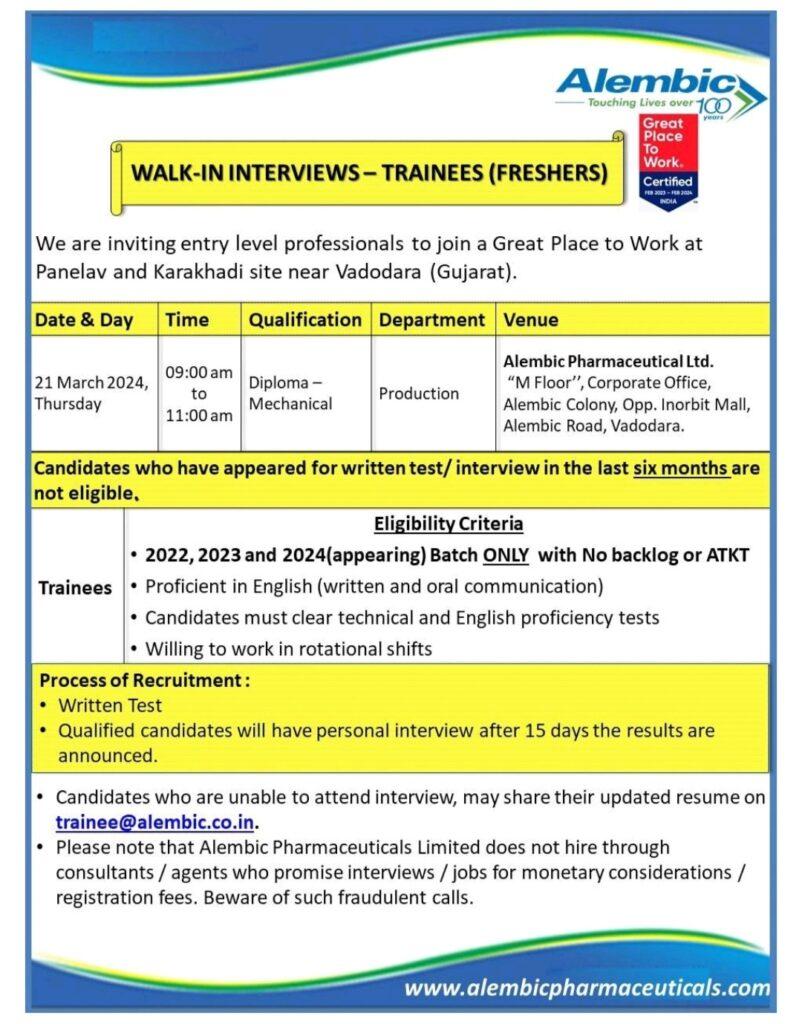 Walk-In Interviews for Freshers – Diploma – Mechanical (2022, 2023 and 2024(appearing) batch only on 21.03.2024 (Thursday) at Vadodara* organised by Alembic Pharmaceutical Limited for its manufacturing sites near Vadodara. Please share this information on your *LinkedIn, Facebook, Campus Watsapp group, Instagram, or Messenger.