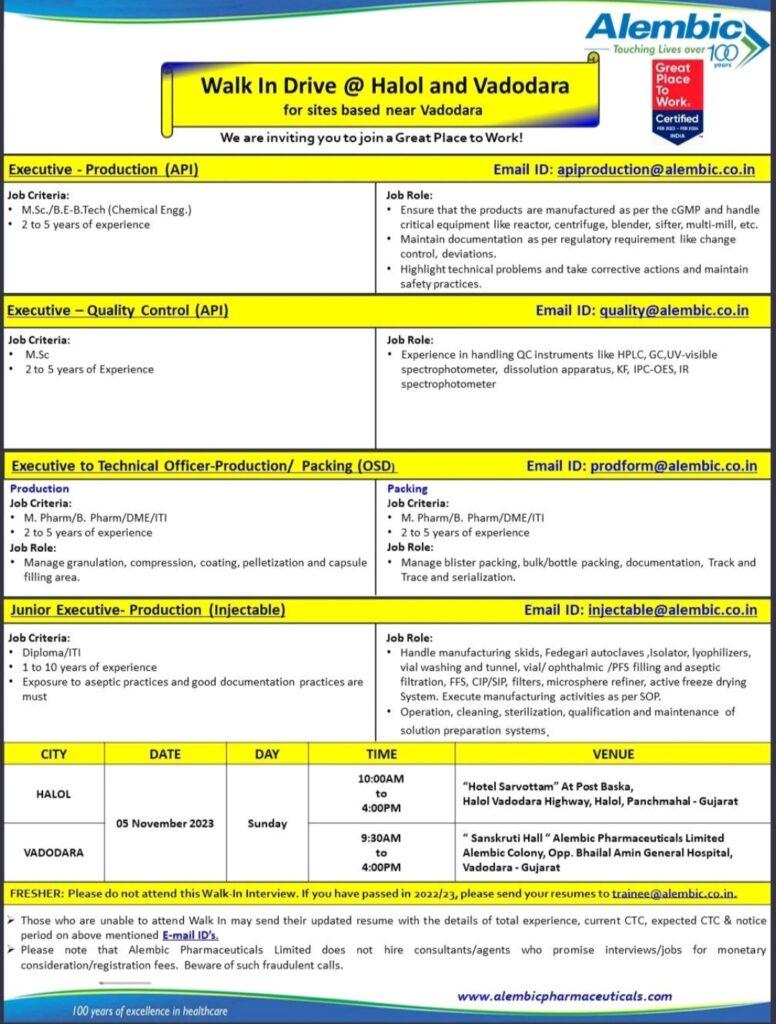Alembic Pharmaceutical Walk In Drive @ Halol and Vadodara on 05th November 2023