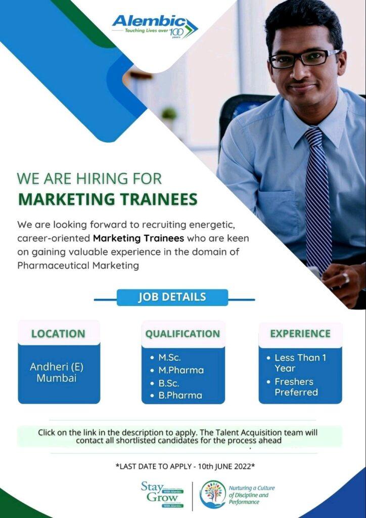 Alembic Pharmaceuticals Limited hiring Freshers Msc/Bsc/MParma/BPharma for Andheri (E), Mumbai